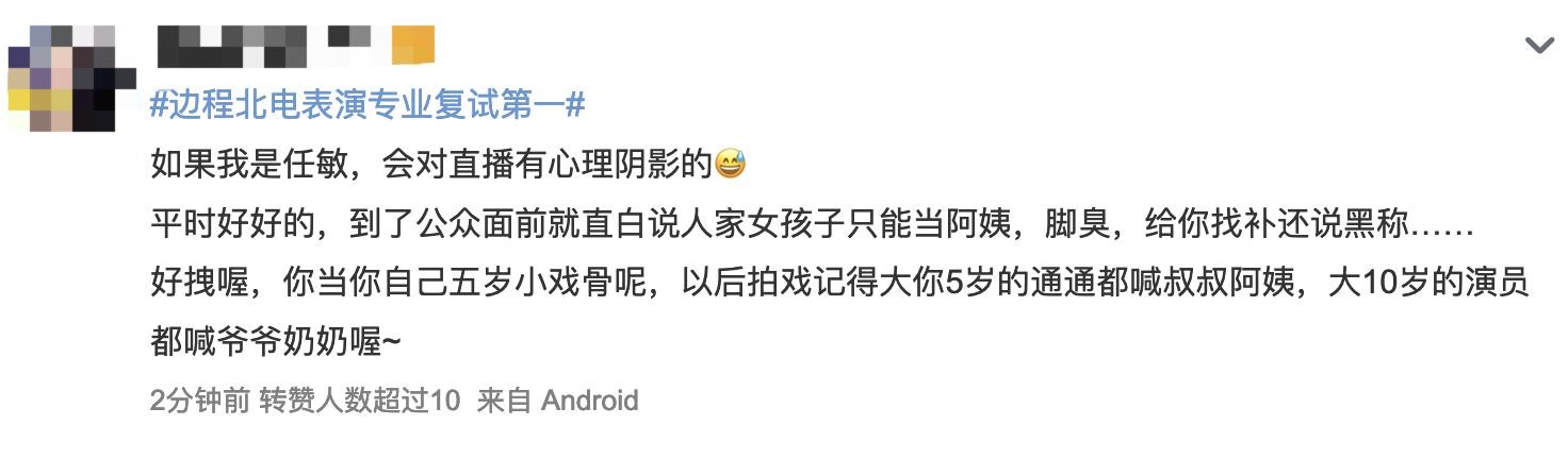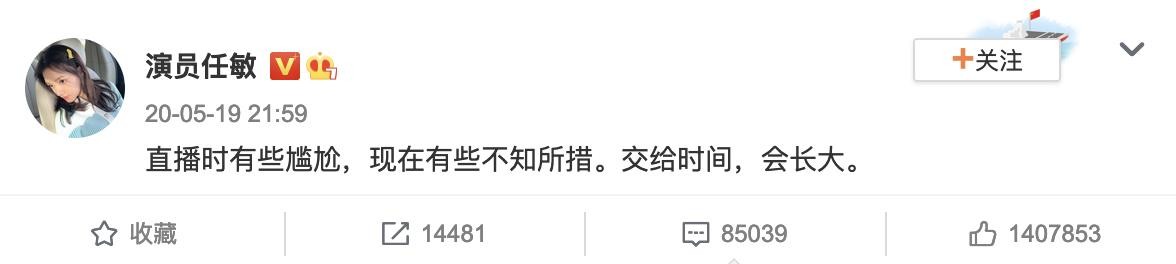 当事人任敏则在当天发文回应了直播,表示自己在直播中有些尴尬,事情发酵后又很不知所措,但还是给边程留了台阶下,称一切“交给时间”,边程“会长大”,言外之意,无非是在说边程年纪还小,可能有些不懂礼貌。