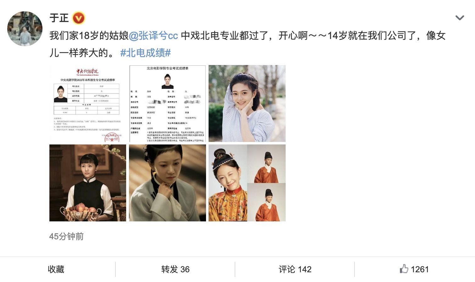 “北电成绩”上热搜后不久,导演于正就晒出了自家公司的小艺人张译兮的成绩,言语中颇为骄傲:“我们家18岁的姑娘张译兮中戏北电专业都过了,开心啊!”