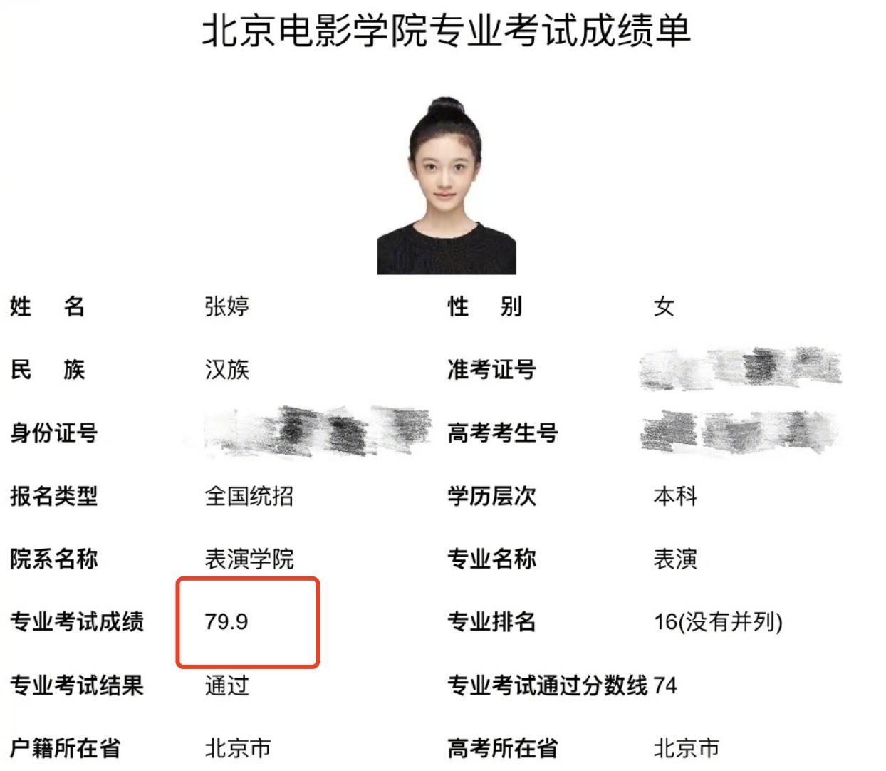 本次北电专业考试通过分数线是74分,张译兮拿到了79.9分的成绩,位列第16名,算是不错的成绩。