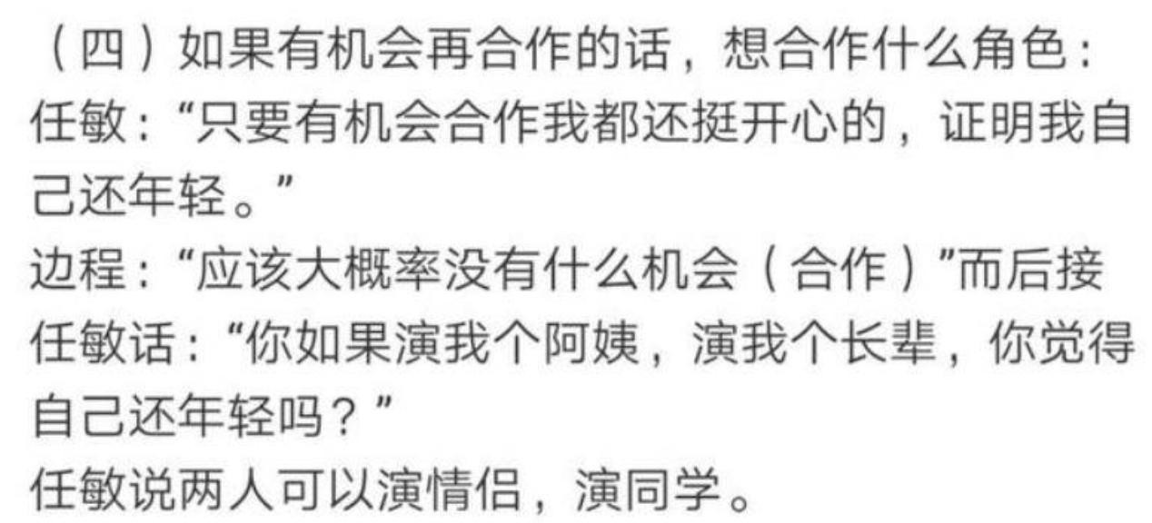 当任敏表示会期待两人之后的再次合作时,边程却毫不客气道:“不会有下次了,难道你演我长辈或者阿姨会很开心吗?”