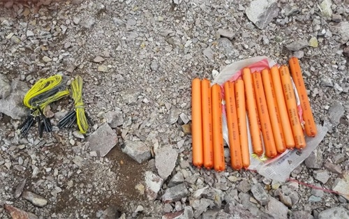 这些炸药含有少量的TNT,主要成分是硝铵炸药,并且还找到了21个雷管,各种塑料袋和起爆线,以及绝缘布等。