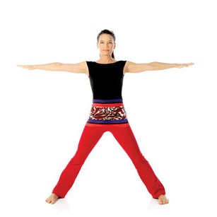 3.暖身:深吸气,同时胸部上提。呼气时,髋部往左推,躯干往右弯,右手放在膝盖上方或下方。左臂上举成斜线,掌心向外。吸气时,慢慢地伸直背部。换边做相同的动作,每边做2~5次;